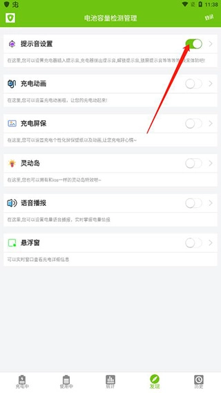 4、在发现页面,还能开启提示音设置、充电动画、充电屏保、灵动岛、语音播报等功能。
