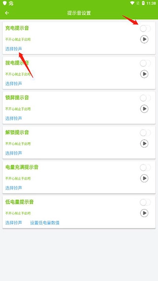 6、挑选想要开启的提示音,像充电提示音这类,直接选择对应的铃声即可。