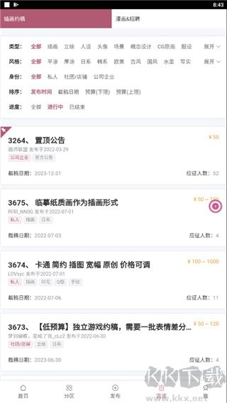 5、在软件的需求栏,你可以查看不同类型的插画约稿,也可以发布不同类型的漫画招聘。