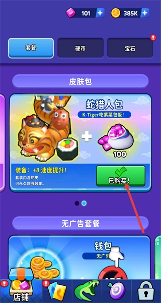 4、返回商店已购买的皮肤包如蛇猎人包会显示已购买,装备对应皮肤可获得属性加成如速度+8,提升游戏体验。