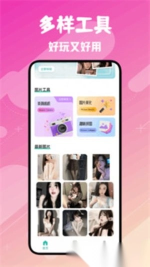 1.在本页面的Fansly相机软件中,启动后会进入主界面,在该界面你能够使用美颜相机、图片美化、趣味拼图等各类工具。