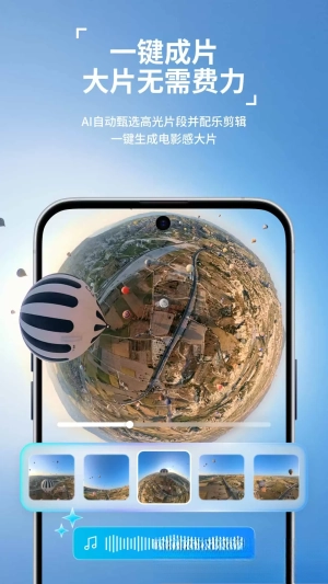 1.AI智能剪辑可自动识别并挑选拍摄素材里的优质画面,一键制作出富有电影质感的短片,并且保留了完整的后期手动调整功能。
