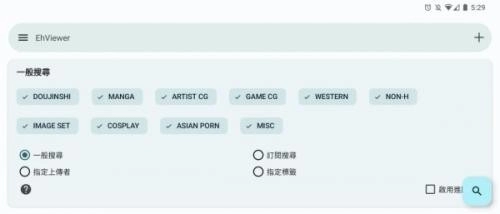 1.点选EhViewer首页的搜寻栏旁边的+号,开启过滤条件,点一下就能过滤掉该分类的结果,例如「Non-H」过滤普遍级内容。