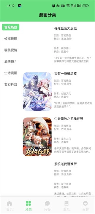 2、来到分类的页面中可以通过漫画的类型,在冒险热血、侦探推理、耽美爱情、武侠格斗等分类查看;